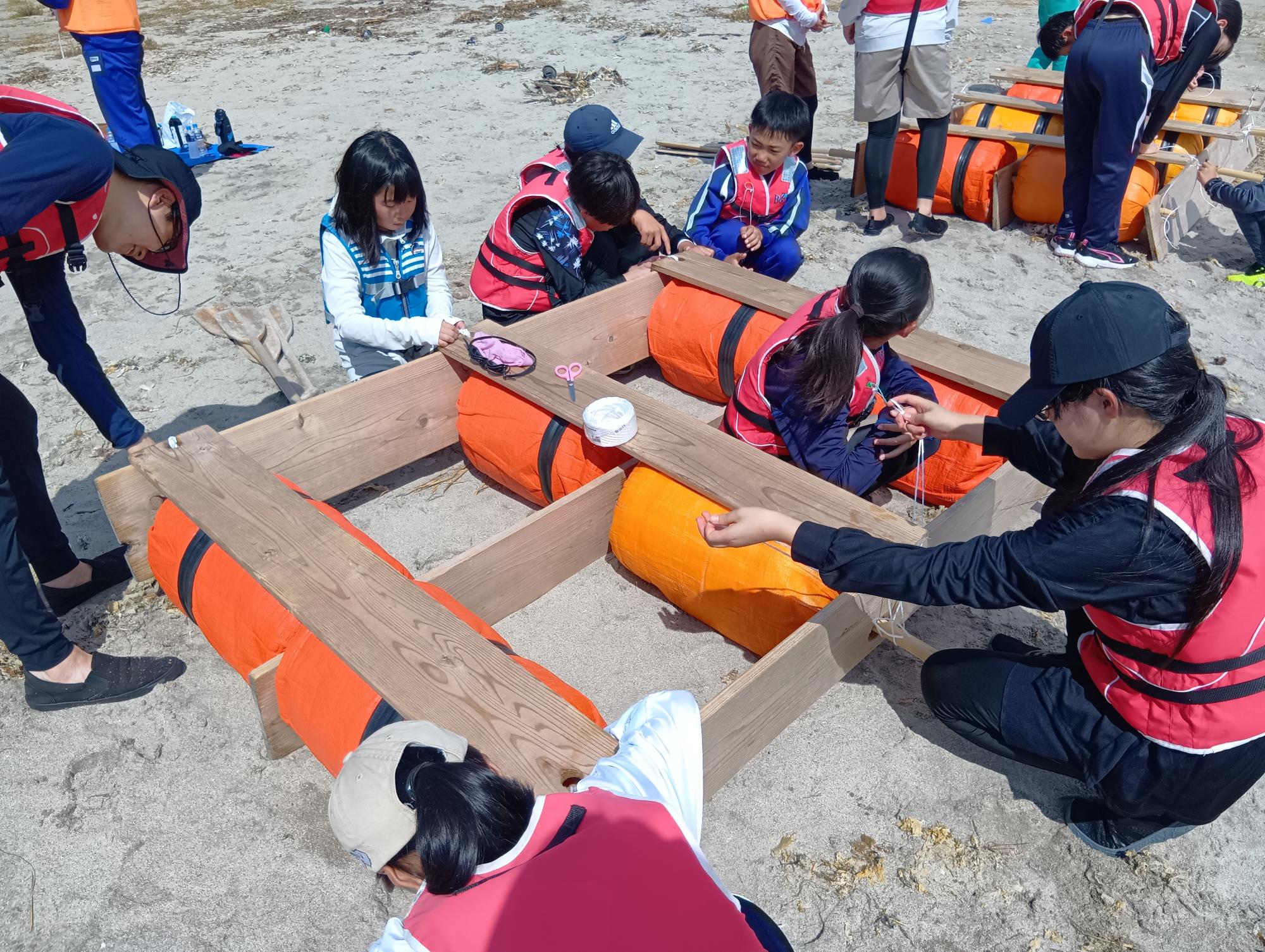 初日はイカダ作り。どうすれば丈夫なイカダになるか、自分たちで考えて組み上げました。