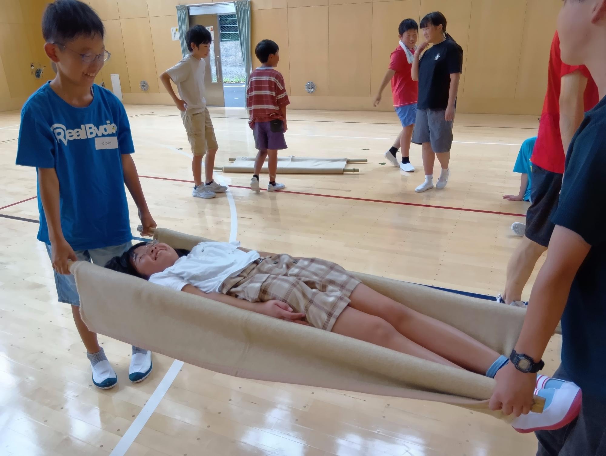 2日目は室内の活動がメインになりました。防災学習では毛布と棒で担架を作るなど、災害時にも役立つ道具を作成しました。