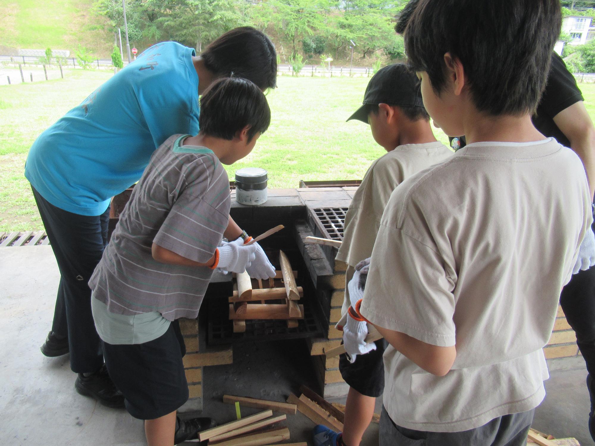 かまど担当は、汗びっしょりになりながら火の世話をしました。