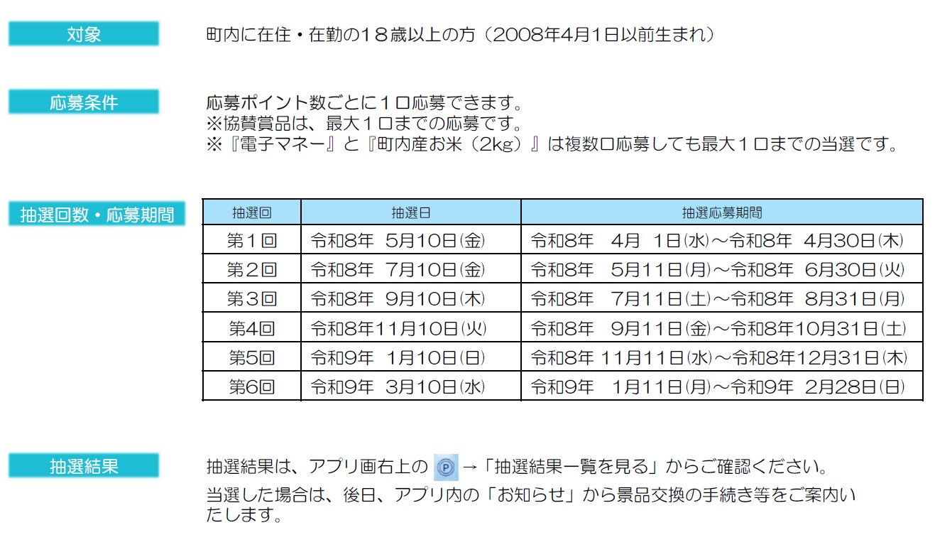 アプリでは”歩く”だけでなく、体組成の測定や町の健康セミナーやイベントへの参加等によりポイントが貯まり、景品抽選に応募することができるなど、楽しく続けられる機能や仕組みをご用意しております。ぜひ皆様の毎日の健康づくりにお役立てください。