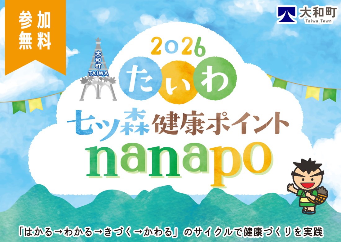 大和町では、令和7年3月に『健康たいわ21プラン(第3次)』を策定し、町民の健康意識の醸成を図り、心身ともに健康で元気な健康寿命社会を目指しています。町民の皆様お一人お一人が日々の運動や食生活の改善、健康教室やイベントへの参加などの健康づくりに楽しみながら継続的に取り組んでいけるよう、スマートフォンアプリを活用した新たな事業として、たいわ七ツ森健康ポイント”nanapo”(ナナポ)を実施いたします。