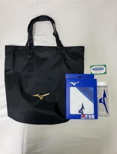 抽選の景品として、ミズノオリジナルグッズ3点セット・自主事業無料券3セットを提供します。